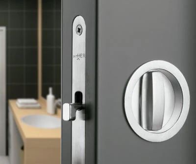 Cerraduras de gancho, tiradores integrados y kits de condena para baños.